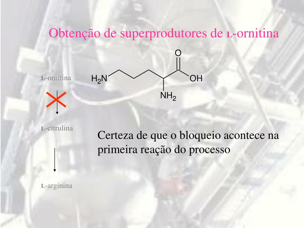 Obtenção de superprodutores de L-ornitina L-ornitina L-citrulina Certeza de que o bloqueio acontece na primeira reação do processo L-arginina