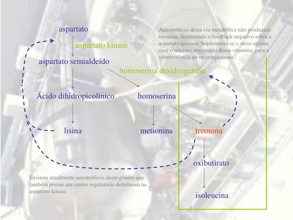 aspartato Auxotróficos desta via metabólica não produzem treonina, diminuindo o feedback negativo sobre a aspartato quinase. Suplementa-se o meio apenas com o mínimo necessário dessa vitamina, para a sobrevivência do microrganismo. aspartato kinase aspartato semialdeído homoserina desidrogenase Ácido dihidropicolínico homoserina lisina metionina treonina oxibutirato Existem atualmente auxotróficos deste gênero que também possui um centro regulatório defeituoso na aspartato kinase. isoleucina