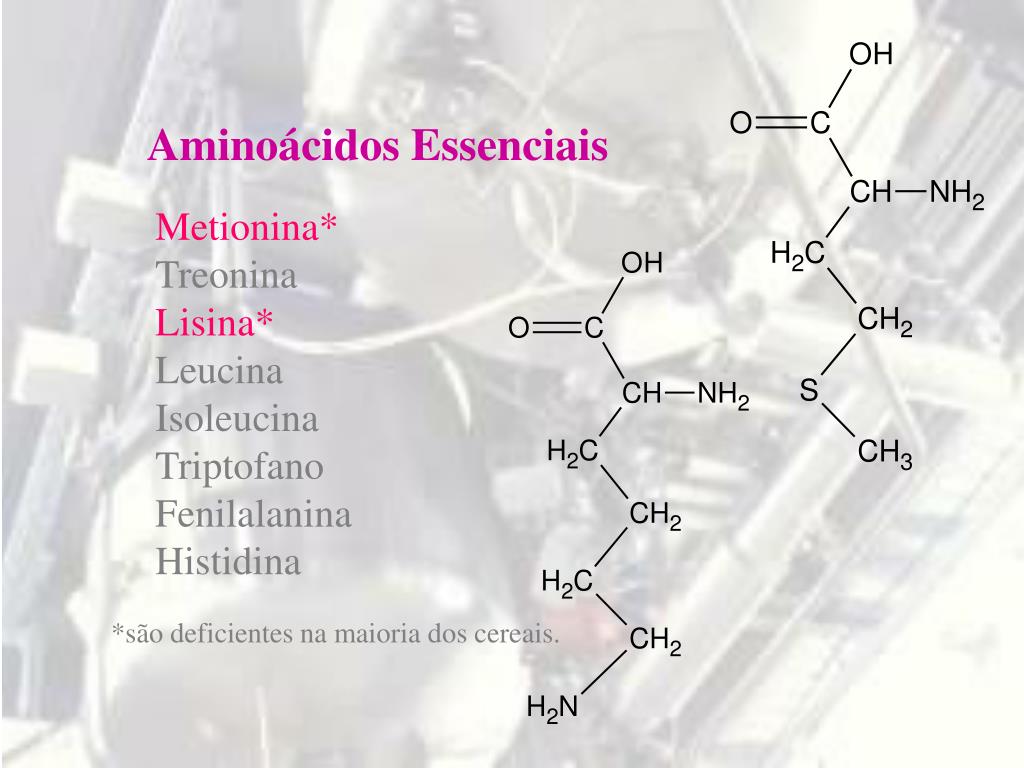 Aminoácidos Essenciais Metionina* Treonina Lisina* Leucina Isoleucina Triptofano Fenilalanina Histidina *são deficientes na maioria dos cereais.