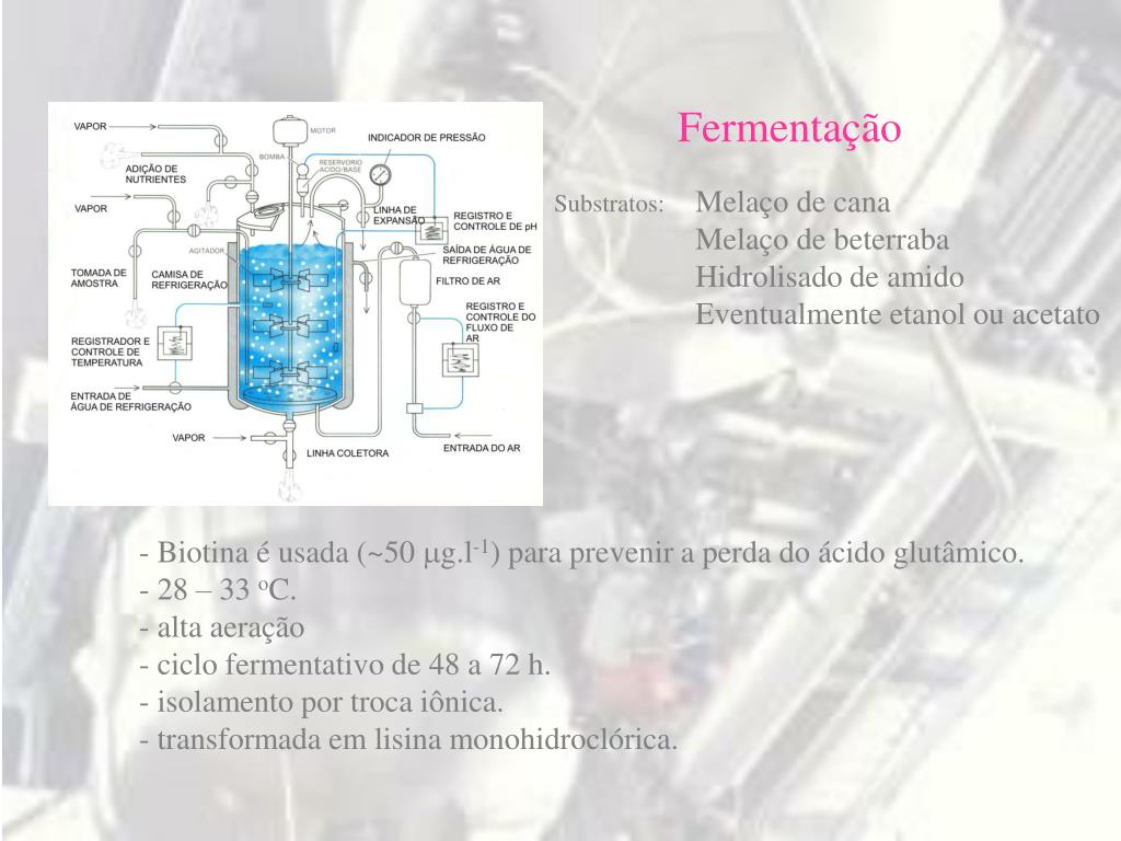 Fermentação Melaço de cana Melaço de beterraba Hidrolisado de amido Eventualmente etanol ou acetato Substratos: • Biotina é usada (~50 mg.l-1) para prevenir a perda do ácido glutâmico. • 28 – 33 oC. • alta aeração • ciclo fermentativo de 48 a 72 h. • isolamento por troca iônica. • transformada em lisina monohidroclórica.