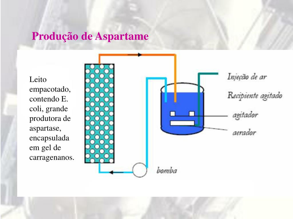 Produção de Aspartame Leito empacotado, contendo E. coli, grande produtora de aspartase, encapsulada em gel de carragenanos.