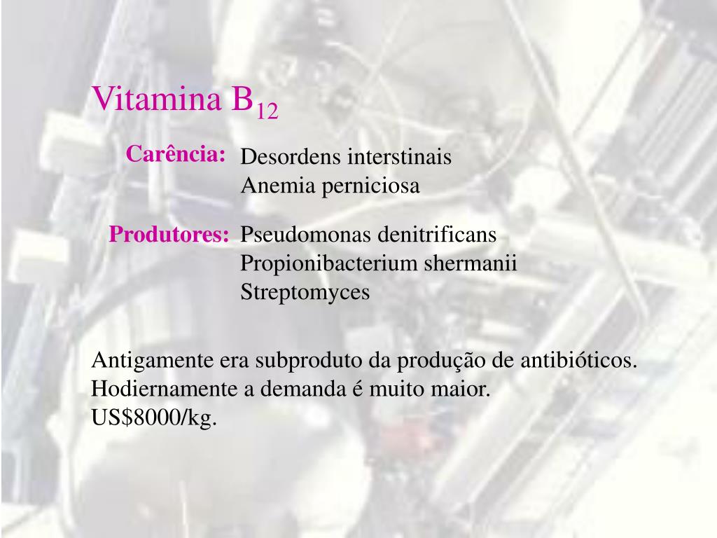 Vitamina B12 Carência: Desordens interstinais Anemia perniciosa Produtores: Pseudomonas denitrificans Propionibacterium shermanii Streptomyces Antigamente era subproduto da produção de antibióticos. Hodiernamente a demanda é muito maior. US$8000/kg.
