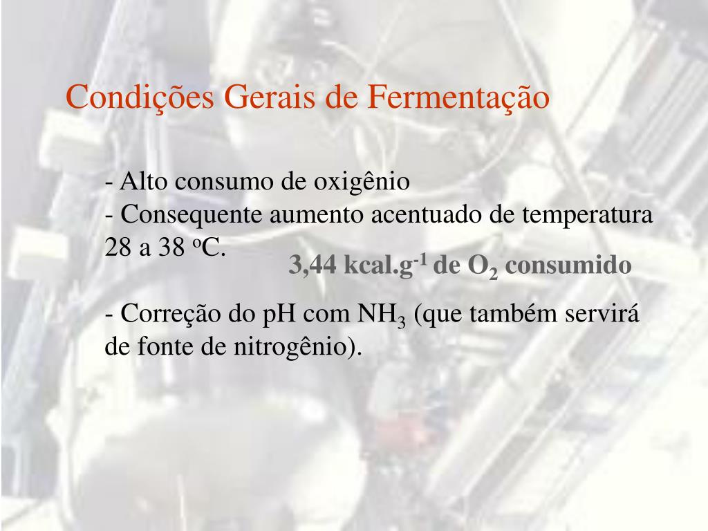 Condições Gerais de Fermentação • Alto consumo de oxigênio • Consequente aumento acentuado de temperatura 28 a 38 oC. • Correção do pH com NH3 (que também servirá de fonte de nitrogênio). 3,44 kcal.g-1 de O2 consumido