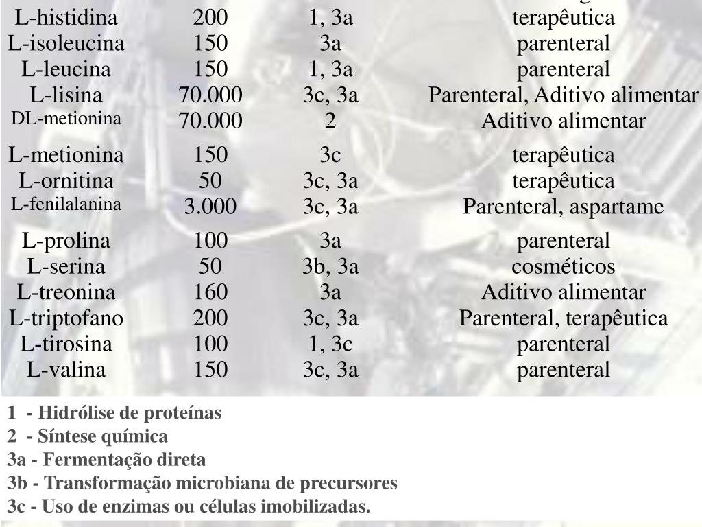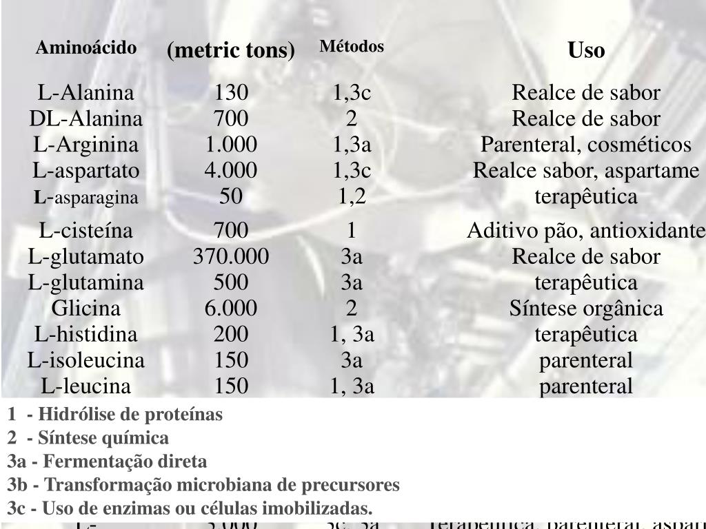 Aminoácido (metric tons) Métodos Uso L-Alanina 130 1,3c Realce de sabor DL-Alanina 700 2 Realce de sabor L-Arginina 1.000 1,3a Parenteral, cosméticos L-aspartato 4.000 1,3c Realce sabor, aspartame L-asparagina 50 1,2 terapêutica L-cisteína 700 1 Aditivo pão, antioxidante L-glutamato 370.000 3a Realce de sabor L-glutamina 500 3a terapêutica Glicina 6.000 2 Síntese orgânica L-histidina 200 1, 3a terapêutica L-isoleucina 150 3a parenteral L-leucina 150 1, 3a parenteral L-lisina 70.000 3c, 3a Parenteral, Aditivo alimentar DL-metionina 70.000 2 Aditivo alimentar L-metionina 150 3c terapêutica L-ornitina 50 3c, 3a terapêutica L-fenilalanina 3.000 3c, 3a Terapêutica, parenteral, aspartame L-prolina 100 3a parenteral L-serina 50 3b, 3a cosméticos L-treonina 160 3a Aditivo alimentar L-triptofano 200 3c, 3a Parenteral, terapêutica L-tirosina 100 1, 3c parenteral L-valina 150 3c, 3a parenteral 1 - Hidrólise de proteínas 2 - Síntese química 3a - Fermentação direta 3b - Transformação microbiana de precursores 3c - Uso de enzimas ou células imobilizadas.
