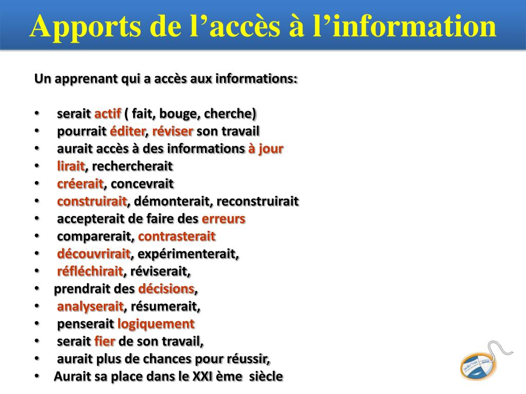 Apports de l’accès à l’information • Un apprenant qui a accès aux informations: • serait actif ( fait, bouge, cherche) • pourrait éditer, réviser son travail • aurait accès à des informations à jour • lirait, rechercherait • créerait, concevrait • construirait, démonterait, reconstruirait • accepterait de faire des erreurs • comparerait, contrasterait • découvrirait, expérimenterait, • réfléchirait, réviserait, • prendrait des décisions, • analyserait, résumerait, • penserait logiquement • serait fier de son travail, • aurait plus de chances pour réussir, • Aurait sa place dans le XXI ème siècle