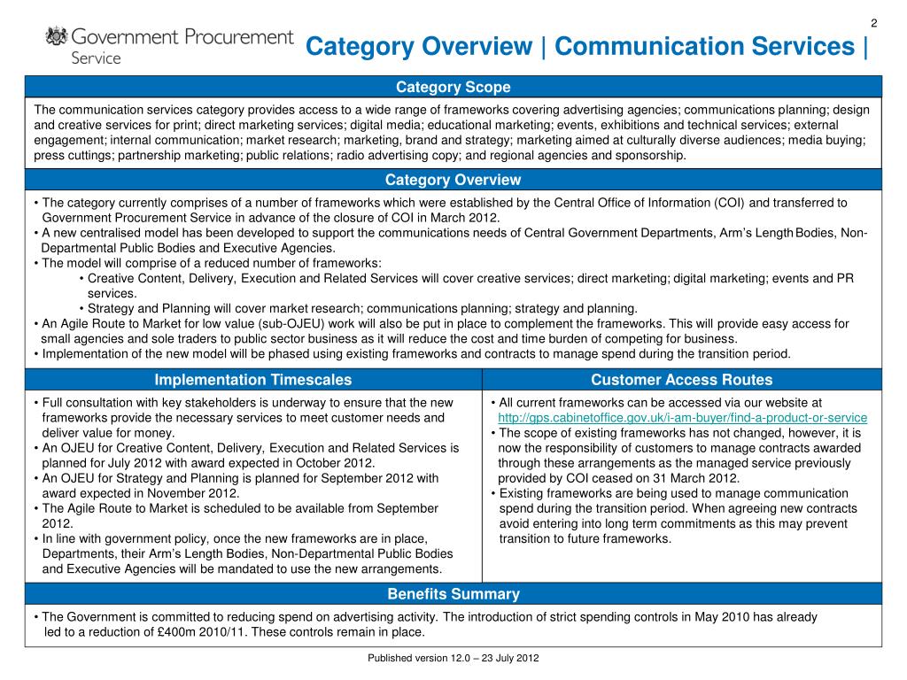 Category Overview | Communication Services | Category Scope The communication services category provides access to a wide range of frameworks covering advertising agencies; communications planning; design and creative services for print; direct marketing services; digital media; educational marketing; events, exhibitions and technical services; external engagement; internal communication; market research; marketing, brand and strategy; marketing aimed at culturally diverse audiences; media buying; press cuttings; partnership marketing; public relations; radio advertising copy; and regional agencies and sponsorship. Category Overview • The category currently comprises of a number of frameworks which were established by the Central Office of Information (COI) and transferred to Government Procurement Service in advance of the closure of COI in March 2012. • A new centralised model has been developed to support the communications needs of Central Government Departments, Arm’s Length Bodies, Non- Departmental Public Bodies and Executive Agencies. • The model will comprise of a reduced number of frameworks: • Creative Content, Delivery, Execution and Related Services will cover creative services; direct marketing; digital marketing; events and PR services. • Strategy and Planning will cover market research; communications planning; strategy and planning. • An Agile Route to Market for low value (sub-OJEU) work will also be put in place to complement the frameworks. This will provide easy access for small agencies and sole traders to public sector business as it will reduce the cost and time burden of competing for business. • Implementation of the new model will be phased using existing frameworks and contracts to manage spend during the transition period. Implementation Timescales Customer Access Routes • Full consultation with key stakeholders is underway to ensure that the new frameworks provide the necessary services to meet customer needs and deliver value for money. • An OJEU for Creative Content, Delivery, Execution and Related Services is planned for July 2012 with award expected in October 2012. • An OJEU for Strategy and Planning is planned for September 2012 with award expected in November 2012. • The Agile Route to Market is scheduled to be available from September 2012. • In line with government policy, once the new frameworks are in place, Departments, their Arm’s Length Bodies, Non-Departmental Public Bodies and Executive Agencies will be mandated to use the new arrangements. • All current frameworks can be accessed via our website at http://gps.cabinetoffice.gov.uk/i-am-buyer/find-a-product-or-service • The scope of existing frameworks has not changed, however, it is now the responsibility of customers to manage contracts awarded through these arrangements as the managed service previously provided by COI ceased on 31 March 2012. • Existing frameworks are being used to manage communication spend during the transition period. When agreeing new contracts avoid entering into long term commitments as this may prevent transition to future frameworks. Benefits Summary • The Government is committed to reducing spend on advertising activity. The introduction of strict spending controls in May 2010 has already led to a reduction of £400m 2010/11. These controls remain in place. Published version 12.0 – 23 July 2012