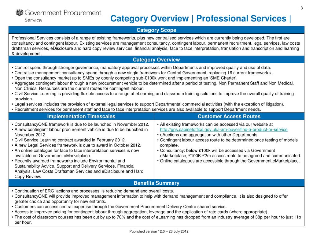Category Overview | Professional Services | Category Scope Professional Services consists of a range of existing frameworks, plus new centralised services which are currently being developed. The first are consultancy and contingent labour. Existing services are management consultancy, contingent labour, permanent recruitment, legal services, law costs draftsman services, eDisclosure and hard copy review services, financial analysis, face to face interpretation, translation and transcription and learning & development. Category Overview • Control spend through stronger governance, mandatory approval processes within Departments and improved quality and use of data. • Centralise management consultancy spend through a new single framework for Central Government, replacing 16 current frameworks. • Open the consultancy market up to SMEs by openly competing sub-£100k work and implementing an ‘SME Charter’. • Aggregate contingent labour through a new procurement vehicle to be determined after a period of testing. Non Permanent Staff and Non Medical, Non Clinical Resources are the current routes for contingent labour. • Civil Service Learning is providing flexible access to a range of eLearning and classroom training solutions to improve the overall quality of training provision. • Legal services includes the provision of external legal services to support Departmental commercial activities (with the exception of litigation). • Recruitment services for permanent staff and face to face interpretation services are also available to support Department needs. Implementation Timescales Customer Access Routes • ConsultancyONE framework is due to be launched in November 2012. • A new contingent labour procurement vehicle is due to be launched in November 2012. • Civil Service Learning contract awarded in February 2012. • A new Legal Services framework is due to award in October 2012. • An online catalogue for face to face interpretation services is now available on Government eMarketplace. • Recently awarded frameworks include Environmental and Sustainability Advice, Support and Delivery Services, Financial Analysis, Law Costs Draftsman Services and eDisclosure and Hard Copy Review. • All existing frameworks can be accessed via our website at http://gps.cabinetoffice.gov.uk/i-am-buyer/find-a-product-or-service • eAuctions and aggregation with other Departments. • Contingent labour access route to be determined once testing of models complete. • Consultancy: below £100k will be accessed via Government eMarketplace, £100K-£2m access route to be agreed and communicated. • Online catalogues are accessible through the Government eMarketplace. Benefits Summary • Continuation of ERG ‘actions and processes’ is reducing demand and overall costs. • ConsultancyONE will provide improved management information to help with demand management and compliance. It is also designed to offer greater choice and opportunity for new entrants. • Customers can access central expertise through the Government Procurement Delivery Centre shared service. • Access to improved pricing for contingent labour through aggregation, leverage and the application of rate cards (where appropriate). • The cost of classroom courses has been cut by up to 70% and the cost of eLearning has dropped from an industry average of 38p per hour to just 11p per hour. Published version 12.0 – 23 July 2012