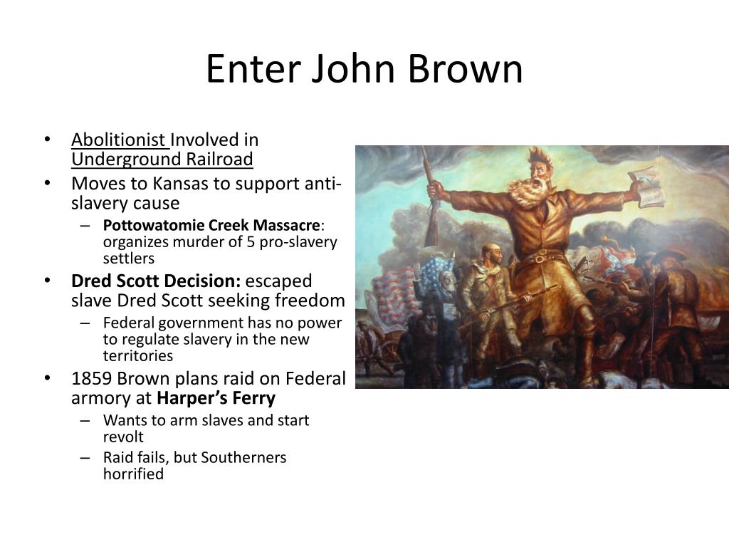 Enter John Brown • Abolitionist Involved in Underground Railroad • Moves to Kansas to support anti-slavery cause • Pottowatomie Creek Massacre: organizes murder of 5 pro-slavery settlers • Dred Scott Decision: escaped slave Dred Scott seeking freedom • Federal government has no power to regulate slavery in the new territories • 1859 Brown plans raid on Federal armory at Harper’s Ferry • Wants to arm slaves and start revolt • Raid fails, but Southerners horrified