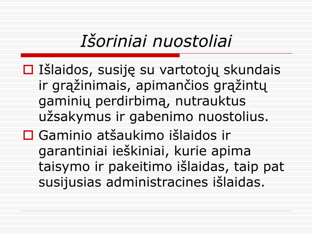 Išoriniai nuostoliai • Išlaidos, susiję su vartotojų skundais ir grąžinimais, apimančios grąžintų gaminių perdirbimą, nutrauktus užsakymus ir gabenimo nuostolius. • Gaminio atšaukimo išlaidos ir garantiniai ieškiniai, kurie apima taisymo ir pakeitimo išlaidas, taip pat susijusias administracines išlaidas.