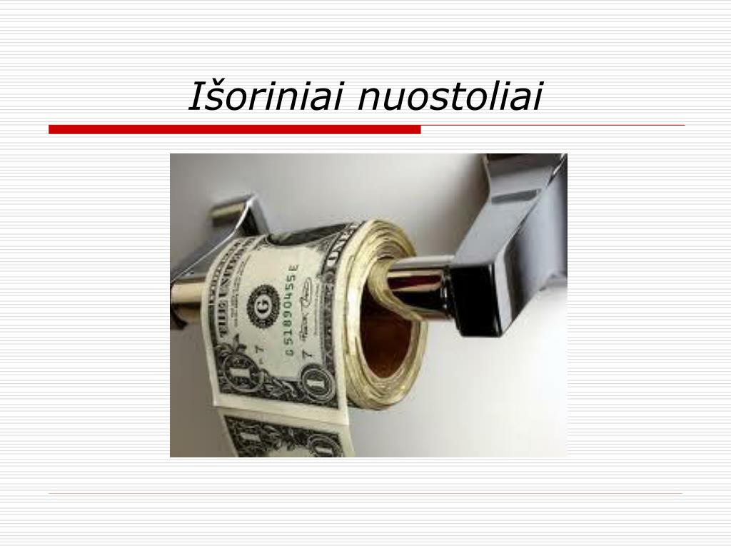 Vidiniai nuostoliai • Išlaidos dėl atliekų ir perdirbimo, kurios apima medžiagas, darbą ir pridėtines išlaidas. • Korekciniai veiksmai – laikas, sugaištas nesėkmių priežasčių ir gamybos koregavimo problemų nustatymui. • Nuostoliai, susiję su įplaukų praradimu, kai gaminiai parduodami mažesne kaina, kadangi jie neatitinka specifikacijų. • Procesų nuostoliai – neplanuotos įrangos prastovos arba neplanuotas įrangos remontas.