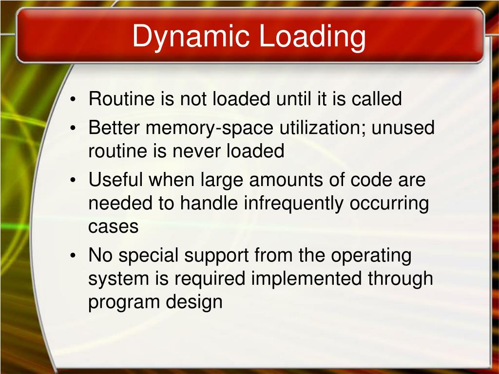 Dynamic Loading • Routine is not loaded until it is called • Better memory-space utilization; unused routine is never loaded • Useful when large amounts of code are needed to handle infrequently occurring cases • No special support from the operating system is required implemented through program design