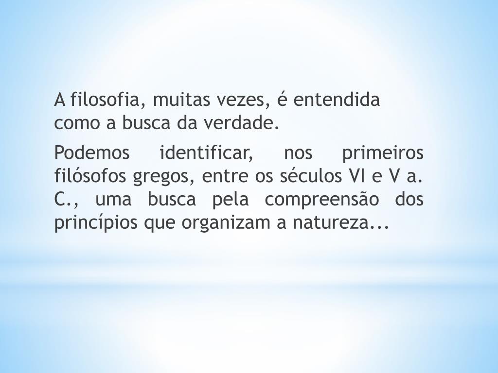 O que é Filosofia?. Em busca de uma compreensão. A filosofia, muitas vezes, é entendida como a busca da verdade. Podemos identificar, nos primeiros filósofos gregos, entre os séculos VI e V a. C., uma busca pela compreensão dos princípios que organizam a natureza... .