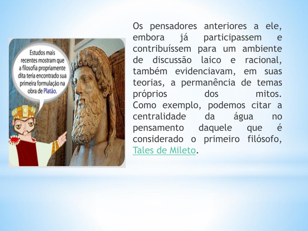 Os pensadores anteriores a ele, embora já participassem e contribuíssem para um ambiente de discussão laico e racional, também evidenciavam, em suas teorias, a permanência de temas próprios dos mitos. Como exemplo, podemos citar a centralidade da água no pensamento daquele que é considerado o primeiro filósofo, Tales de Mileto.
