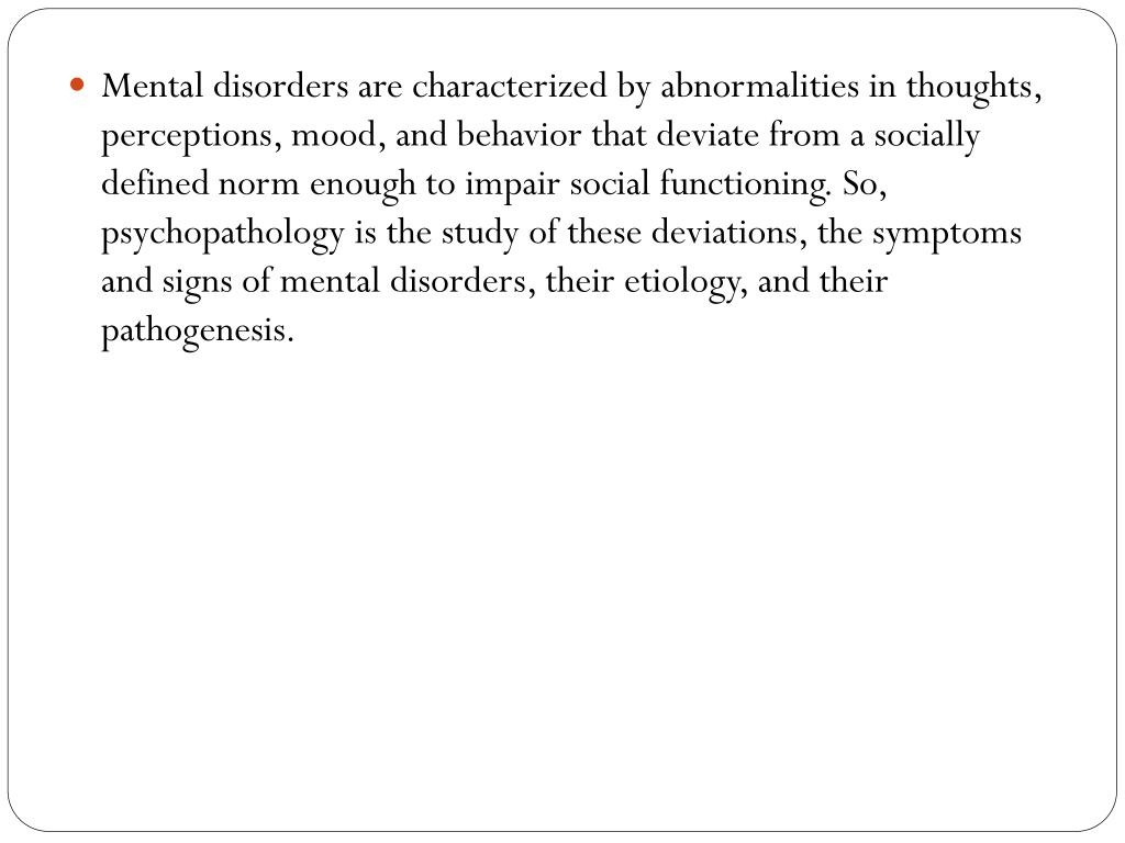Mental disorders are characterized by abnormalities in thoughts, perceptions, mood, and behavior that deviate from a socially defined norm enough to impair social functioning. So, psychopathology is the study of these deviations, the symptoms and signs of mental disorders, their etiology, and their pathogenesis.