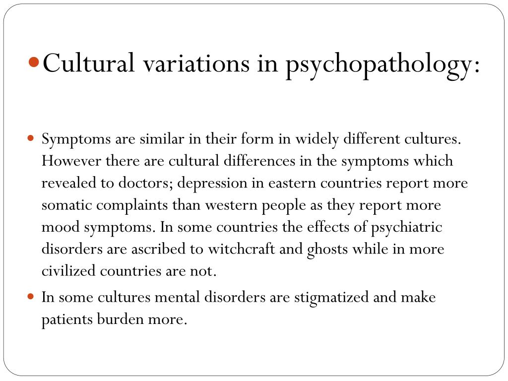 Cultural variations in psychopathology: • Symptoms are similar in their form in widely different cultures. However there are cultural differences in the symptoms which revealed to doctors; depression in eastern countries report more somatic complaints than western people as they report more mood symptoms. In some countries the effects of psychiatric disorders are ascribed to witchcraft and ghosts while in more civilized countries are not. • In some cultures mental disorders are stigmatized and make patients burden more.