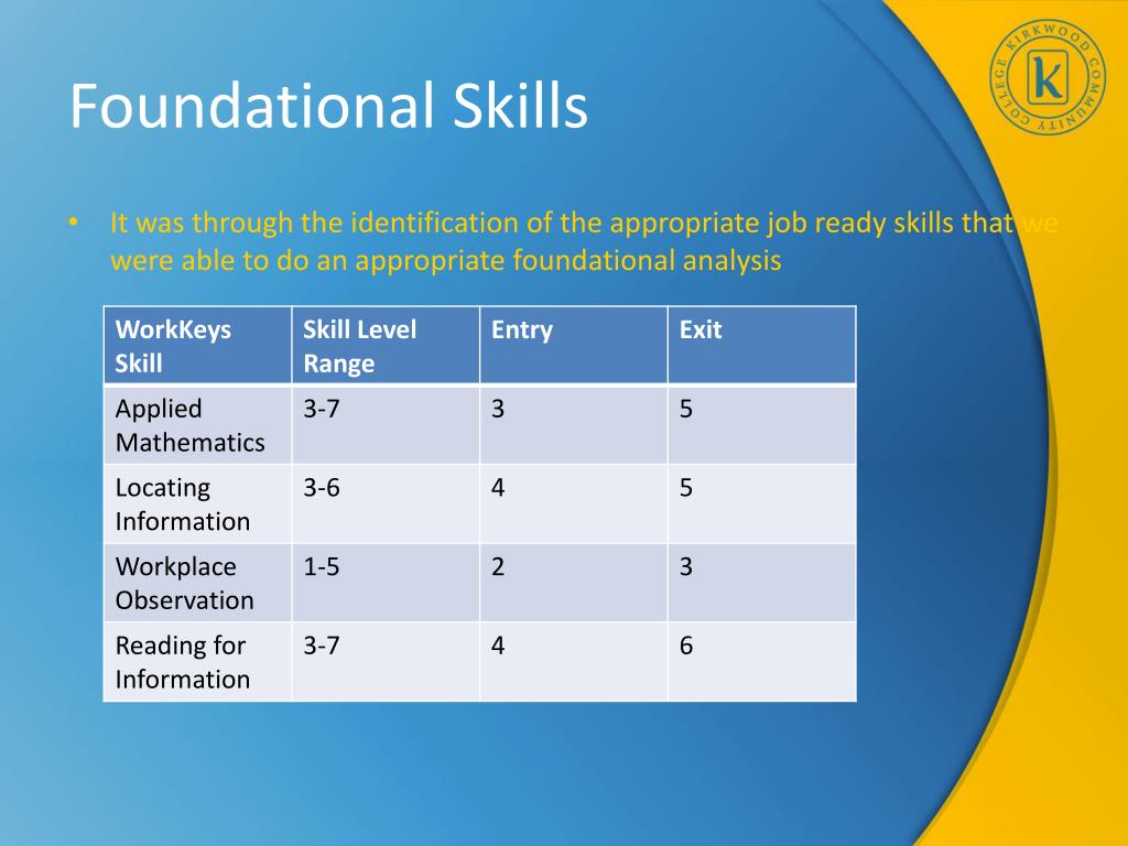 Foundational Skills • It was through the identification of the appropriate job ready skills that we were able to do an appropriate foundational analysis