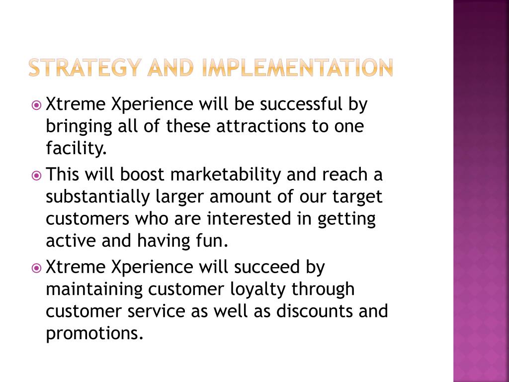 Strategy and implementation • XtremeXperience will be successful by bringing all of these attractions to one facility. • This will boost marketability and reach a substantially larger amount of our target customers who are interested in getting active and having fun. • XtremeXperience will succeed by maintaining customer loyalty through customer service as well as discounts and promotions.