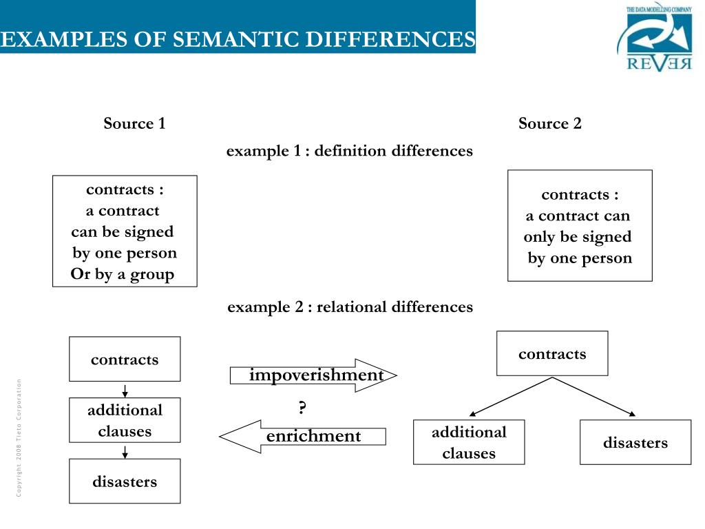 EXAMPLES OF SEMANTIC DIFFERENCES Source 1 Source 2 example 1 : definition differences contracts : a contract can only be signed by one person contracts : a contract can be signed by one person Or by a group example 2 : relational differences contracts contracts impoverishment ? additional clauses enrichment additional clauses disasters disasters