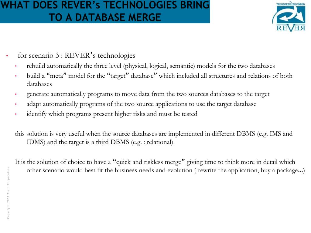for scenario 3 : REVER’s technologies rebuild automatically the three level (physical, logical, semantic) models for the two databases build a “meta” model for the “target” database” which included all structures and relations of both databases generate automatically programs to move data from the two sources databases to the target adapt automatically programs of the two source applications to use the target database identify which programs present higher risks and must be tested this solution is very useful when the source databases are implemented in different DBMS (e.g. IMS and IDMS) and the target is a third DBMS (e.g. : relational) It is the solution of choice to have a “quick and riskless merge” giving time to think more in detail which other scenario would best fit the business needs and evolution ( rewrite the application, buy a package…) WHAT DOES REVER’s TECHNOLOGIES BRING TO A DATABASE MERGE