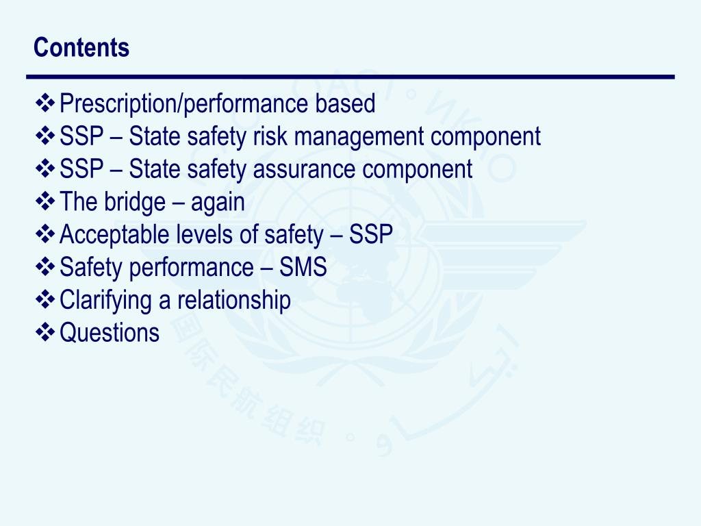 Contents • Prescription/performance based • SSP – State safety risk management component • SSP – State safety assurance component • The bridge – again • Acceptable levels of safety – SSP • Safety performance – SMS • Clarifying a relationship • Questions