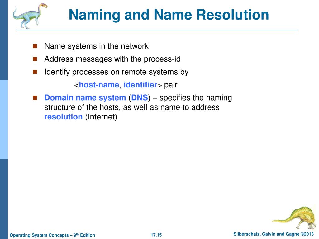 Naming and Name Resolution • Name systems in the network • Address messages with the process-id • Identify processes on remote systems by <host-name, identifier> pair • Domain name system (DNS) – specifies the naming structure of the hosts, as well as name to address resolution (Internet)