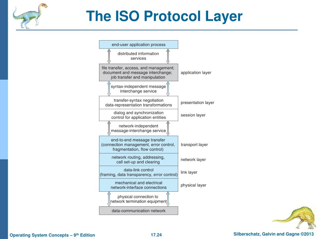 Communication Protocol (Cont.) • Layer 4: Transport layer – responsible for low-level network access and for message transfer between clients, including partitioning messages into packets, maintaining packet order, controlling flow, and generating physical addresses • Layer 5: Session layer – implements sessions, or process-to-process communications protocols • Layer 6: Presentation layer – resolves the differences in formats among the various sites in the network, including character conversions, and half duplex/full duplex (echoing) • Layer 7: Application layer – interacts directly with the users, deals with file transfer, remote-login protocols and electronic mail, as well as schemas for distributed databases