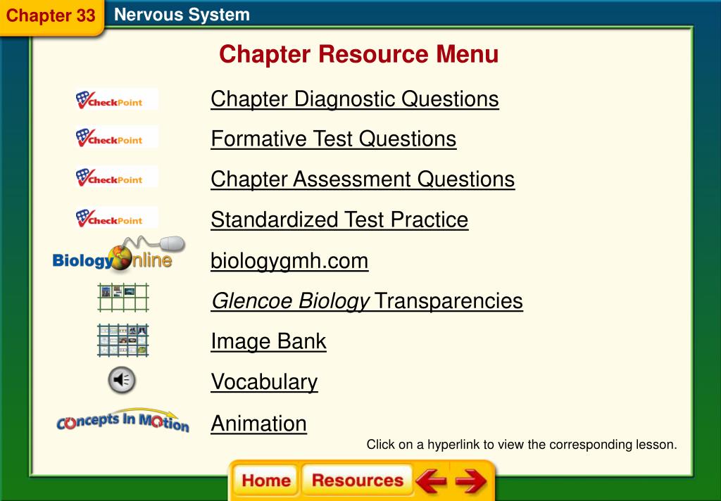 Nervous System Chapter 33 Chapter Resource Menu Chapter Diagnostic Questions Formative Test Questions Chapter Assessment Questions Standardized Test Practice biologygmh.com Glencoe Biology Transparencies Image Bank Vocabulary Animation Click on a hyperlink to view the corresponding lesson.