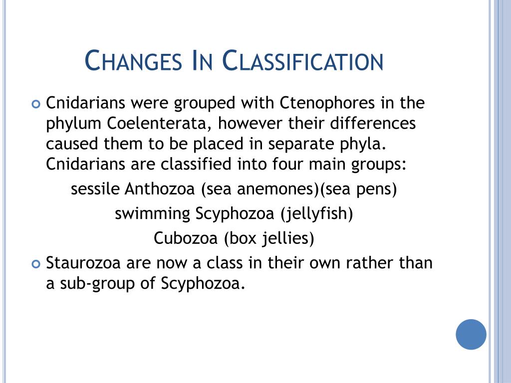 Changes In Classification • Cnidarians were grouped with Ctenophores in the phylum Coelenterata, however their differences caused them to be placed in separate phyla. Cnidarians are classified into four main groups: sessile Anthozoa(sea anemones)(sea pens) swimming Scyphozoa (jellyfish) Cubozoa(box jellies) • Staurozoa are now a class in their own rather than a sub-group of Scyphozoa.