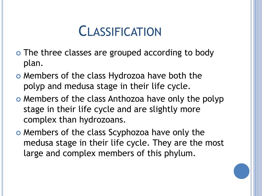 Classification • The three classes are grouped according to body plan. • Members of the class Hydrozoa have both the polyp and medusa stage in their life cycle. • Members of the class Anthozoa have only the polyp stage in their life cycle and are slightly more complex than hydrozoans. • Members of the class Scyphozoa have only the medusa stage in their life cycle. They are the most large and complex members of this phylum.