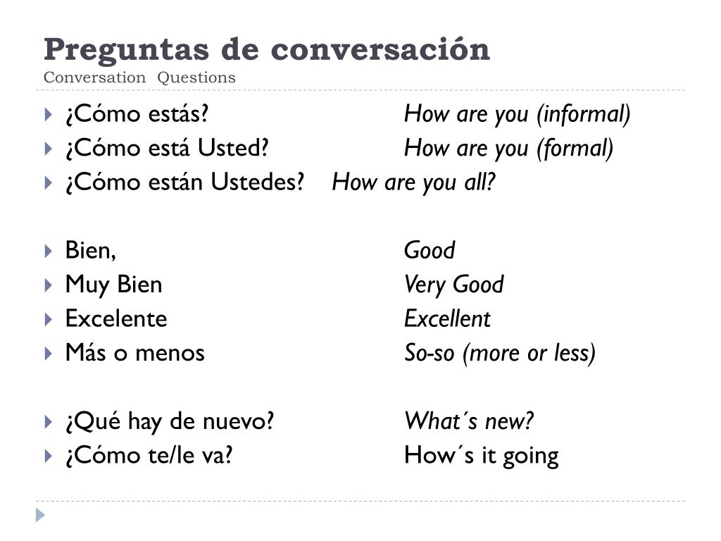 Preguntas de conversación ConversationQuestions • ¿Cómo estás? How are you (informal) • ¿Cómo está Usted? How are you (formal) • ¿Cómo están Ustedes? How are youall? • Bien, Good • Muy Bien VeryGood • Excelente Excellent • Más o menos So-so (more orless) • ¿Qué hay de nuevo? What´s new? • ¿Cómo te/le va? How´sitgoing