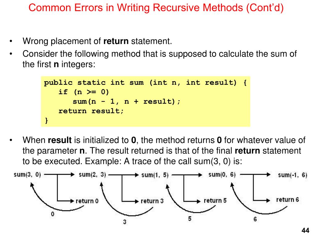Common Errors in Writing Recursive Methods (Cont’d) • A correct version of the method is: • Example: A trace of the call sum(3, 0) is: public static int sum(int n, int result){ if (n == 0) return result; else return sum(n-1, n + result); }