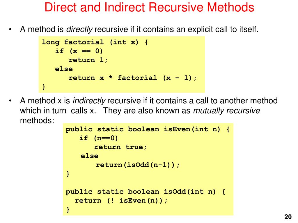 Direct and Indirect Recursive Methods long factorial (int x) { if (x == 0) return 1; else return x * factorial (x – 1); } • A method is directly recursive if it contains an explicit call to itself. • A method x is indirectly recursive if it contains a call to another method which in turn calls x. They are also known as mutually recursive methods: • public static boolean isEven(int n) { • if (n==0) • return true; • else • return(isOdd(n-1)); • } • public static boolean isOdd(int n) { • return (! isEven(n)); • }