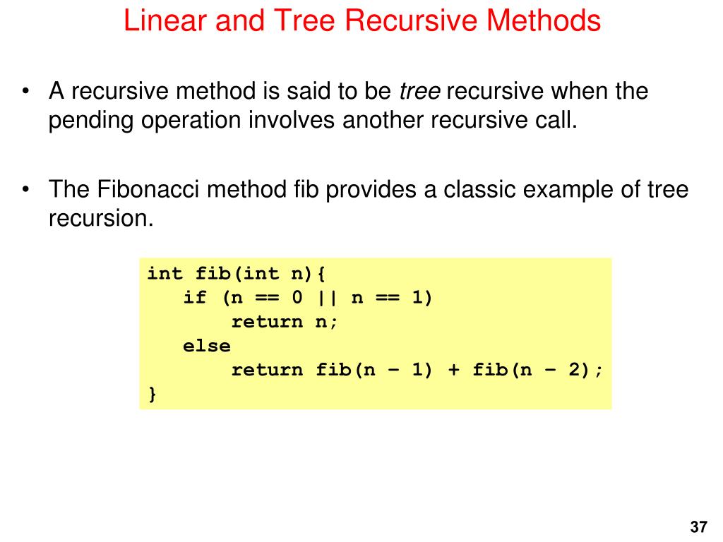 Linear and Tree Recursive Methods • Another way to characterize recursive methods is by the way in which the recursion grows. The two basic ways are "linear" and "tree." • A recursive method is said to be linearly recursive when no pending operation involves another recursive call to the method. • For example, the factorial method is linearly recursive. The pending operation is simply multiplication by a variable, it does not involve another call to factorial. long factorial (int n) { if (n == 0) return 1; else return n * factorial (n – 1); }