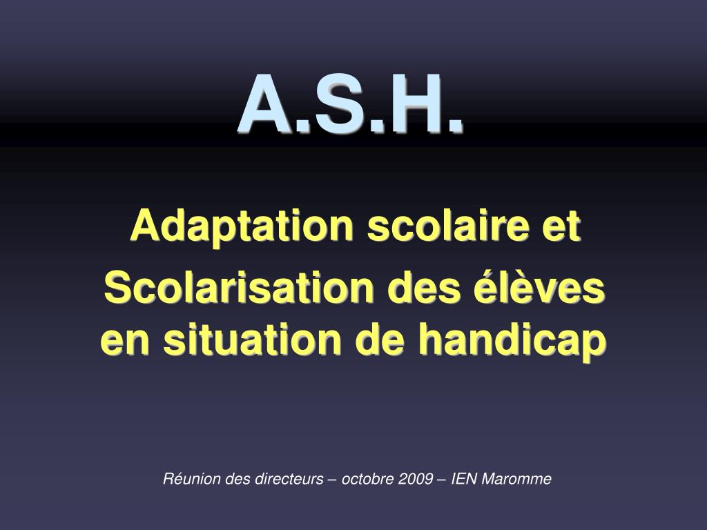 A.S.H. Adaptation scolaire et Scolarisation des élèves en situation de handicap Réunion des directeurs – octobre 2009 – IEN Maromme