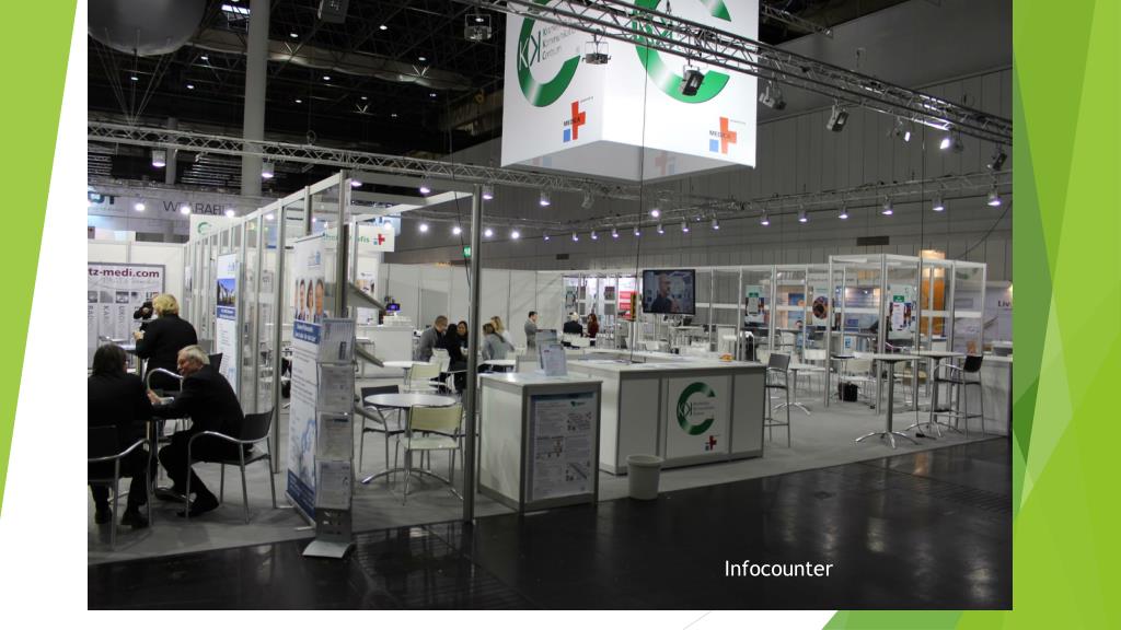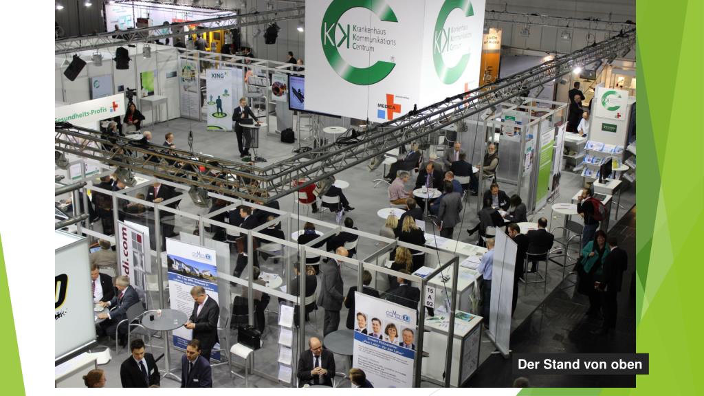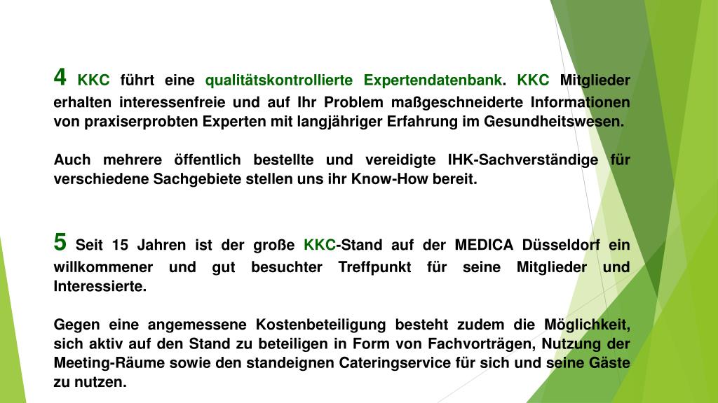 4KKC führt eine qualitätskontrollierte Expertendatenbank. KKC Mitglieder erhalten interessenfreie und auf Ihr Problem maßgeschneiderte Informationen von praxiserprobten Experten mit langjähriger Erfahrung im Gesundheitswesen. Auch mehrere öffentlich bestellte und vereidigte IHK-Sachverständige für verschiedene Sachgebiete stellen uns ihr Know-How bereit. 5 Seit 15 Jahren ist der große KKC-Stand auf der MEDICA Düsseldorf ein willkommener und gut besuchter Treffpunkt für seine Mitglieder und Interessierte. Gegen eine angemessene Kostenbeteiligung besteht zudem die Möglichkeit, sich aktiv auf den Stand zu beteiligen in Form von Fachvorträgen, Nutzung der Meeting-Räume sowie den standeignen Cateringservice für sich und seine Gäste zu nutzen.