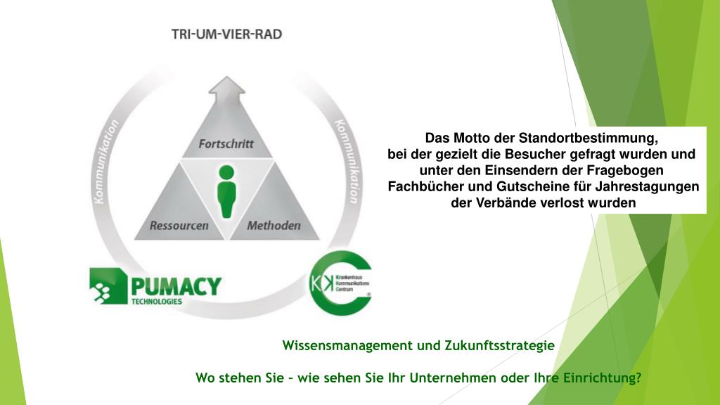 Das Motto der Standortbestimmung, bei der gezielt die Besucher gefragt wurden und unter den Einsendern der Fragebogen Fachbücher und Gutscheine für Jahrestagungen der Verbände verlost wurden Wissensmanagement und Zukunftsstrategie Wo stehen Sie – wie sehen Sie Ihr Unternehmen oder Ihre Einrichtung?
