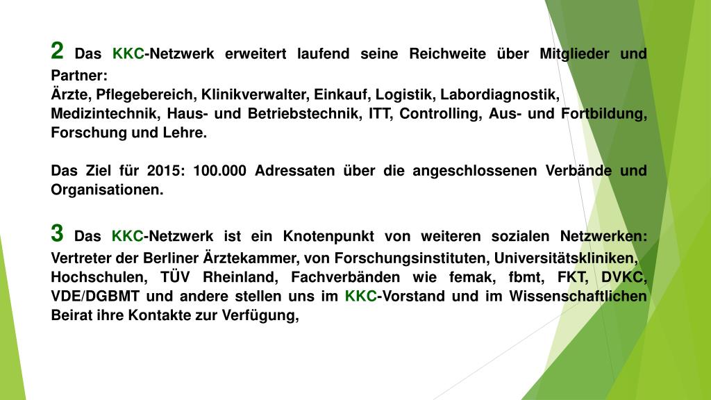 2 Das KKC-Netzwerk erweitert laufend seine Reichweite über Mitglieder und Partner: Ärzte, Pflegebereich, Klinikverwalter, Einkauf, Logistik, Labordiagnostik, Medizintechnik, Haus- und Betriebstechnik, ITT, Controlling, Aus- und Fortbildung, Forschung und Lehre. Das Ziel für 2015: 100.000 Adressaten über die angeschlossenen Verbände und Organisationen. 3 Das KKC-Netzwerk ist ein Knotenpunkt von weiteren sozialen Netzwerken: Vertreter der Berliner Ärztekammer, von Forschungsinstituten, Universitätskliniken, Hochschulen, TÜV Rheinland, Fachverbänden wie femak, fbmt, FKT, DVKC, VDE/DGBMT und andere stellen uns im KKC-Vorstand und im Wissenschaftlichen Beirat ihre Kontakte zur Verfügung,