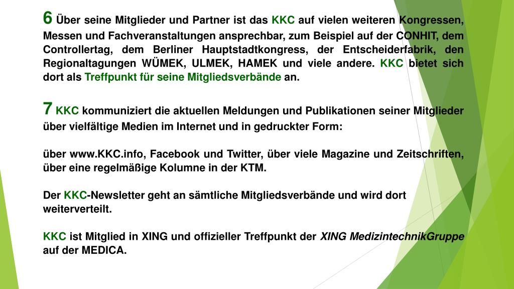 6 Über seine Mitglieder und Partner ist das KKC auf vielen weiteren Kongressen, Messen und Fachveranstaltungen ansprechbar, zum Beispiel auf der CONHIT, dem Controllertag, dem Berliner Hauptstadtkongress, der Entscheiderfabrik, den Regionaltagungen WÜMEK, ULMEK, HAMEK und viele andere. KKC bietet sich dort als Treffpunkt für seine Mitgliedsverbände an. 7KKC kommuniziert die aktuellen Meldungen und Publikationen seiner Mitglieder über vielfältige Medien im Internet und in gedruckter Form: über www.KKC.info, Facebook und Twitter, über viele Magazine und Zeitschriften, über eine regelmäßige Kolumne in der KTM. Der KKC-Newsletter geht an sämtliche Mitgliedsverbände und wird dort weiterverteilt. KKC ist Mitglied in XING und offizieller Treffpunkt der XING MedizintechnikGruppe auf der MEDICA.