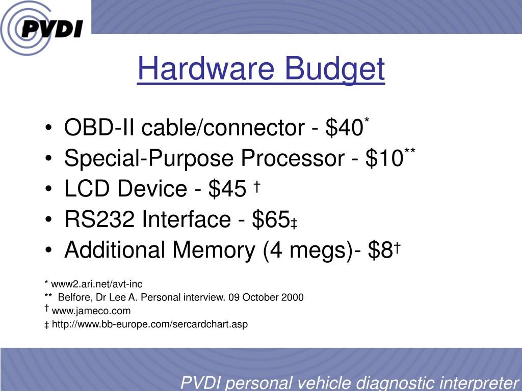 Hardware Budget • OBD-II cable/connector - $40* • Special-Purpose Processor - $10** • LCD Device - $45 † • RS232 Interface - $65‡ • Additional Memory (4 megs)- $8† * www2.ari.net/avt-inc ** Belfore, Dr Lee A. Personal interview. 09 October 2000 † www.jameco.com ‡ http://www.bb-europe.com/sercardchart.asp
