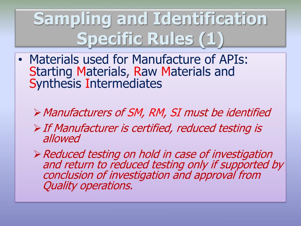 Sampling and Identification Specific Rules (1) • Materials used for Manufacture of APIs: StartingMaterials, RawMaterialsand SynthesisIntermediates • Manufacturers of SM, RM, SI must be identified • If Manufacturer is certified, reduced testing is allowed • Reduced testing on hold in case of investigation and return to reduced testing only if supported by conclusion of investigation and approval from Quality operations.