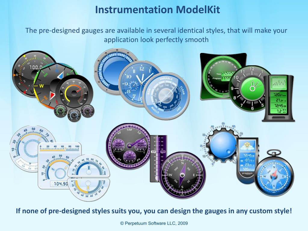 Instrumentation ModelKit The pre-designed gauges are available in several identical styles, that will make your application look perfectly smooth If none of pre-designed styles suits you, you can design the gauges in any custom style!