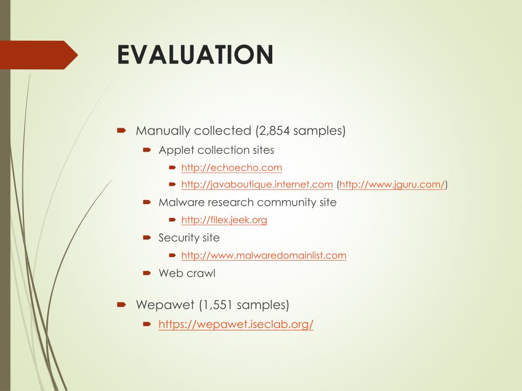 EVALUATION • Manually collected (2,854 samples) • Applet collection sites • http://echoecho.com • http://javaboutique.internet.com (http://www.jguru.com/) • Malware researchcommunity site • http://filex.jeek.org • Security site • http://www.malwaredomainlist.com • Web crawl • Wepawet (1,551 samples) • https://wepawet.iseclab.org/