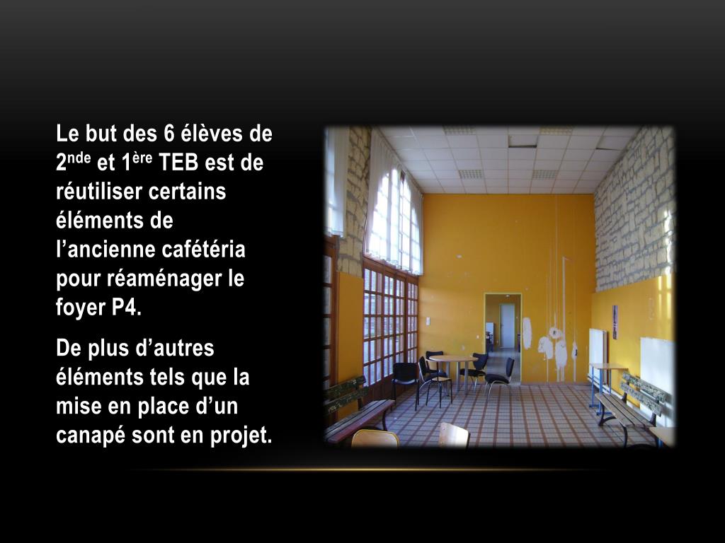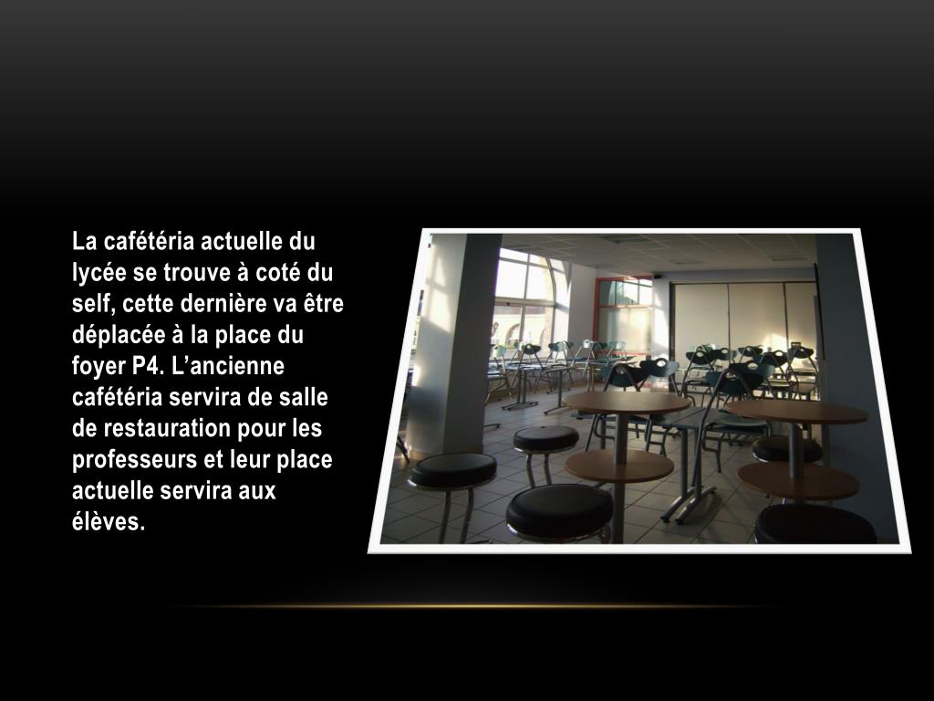 La nouvelle cafétéria du lycée. La cafétéria actuelle du lycée se trouve à coté du self, cette dernière va être déplacée à la place du foyer P4. L’ancienne cafétéria servira de salle de restauration pour les professeurs et leur place actuelle servira aux élèves. .