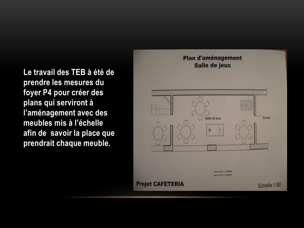 Le travail des TEB à été de prendre les mesures du foyer P4 pour créer des plans qui serviront à l’aménagement avec des meubles mis à l’échelle afin de savoir la place que prendrait chaque meuble.