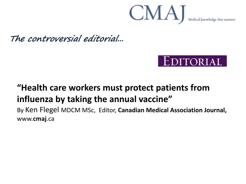 The controversial editorial... “Health care workers must protect patients from influenza by taking the annual vaccine” By Ken Flegel MDCM MSc, Editor, Canadian Medical Association Journal, www.cmaj.ca