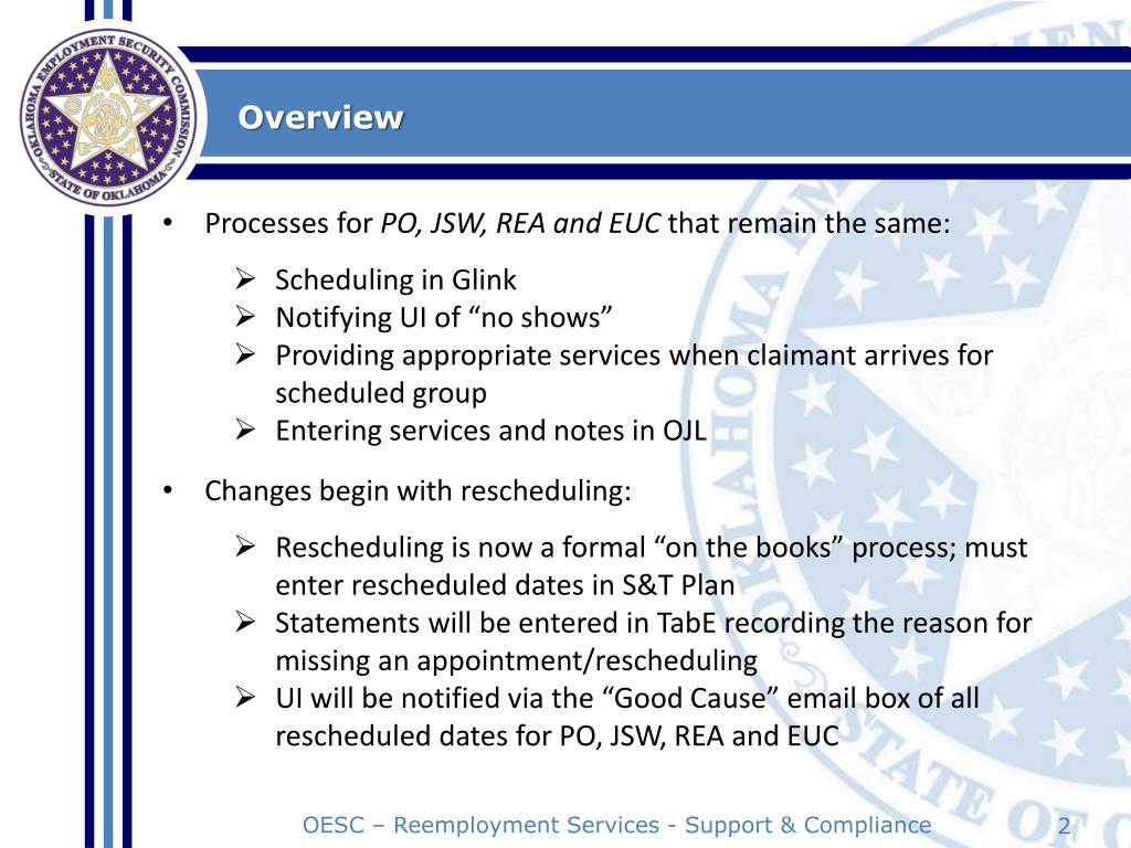Overview • Processes for PO, JSW, REA and EUC that remain the same: • Scheduling in Glink • Notifying UI of “no shows” • Providing appropriate services when claimant arrives for scheduled group • Entering services and notes in OJL • Changes begin with rescheduling: • Rescheduling is now a formal “on the books” process; must enter rescheduled dates in S&T Plan • Statements will be entered in TabE recording the reason for missing an appointment/rescheduling • UI will be notified via the “Good Cause” email box of all rescheduled dates for PO, JSW, REA and EUC