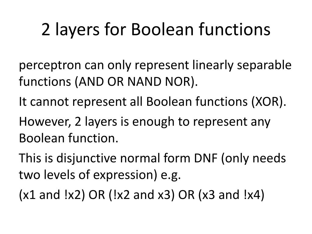 2 layers for Boolean functions perceptron can only represent linearly separable functions (AND OR NAND NOR). It cannot represent all Boolean functions (XOR). However, 2 layers is enough to represent any Boolean function. This is disjunctive normal form DNF (only needs two levels of expression) e.g. (x1 and !x2) OR (!x2 and x3) OR (x3 and !x4)