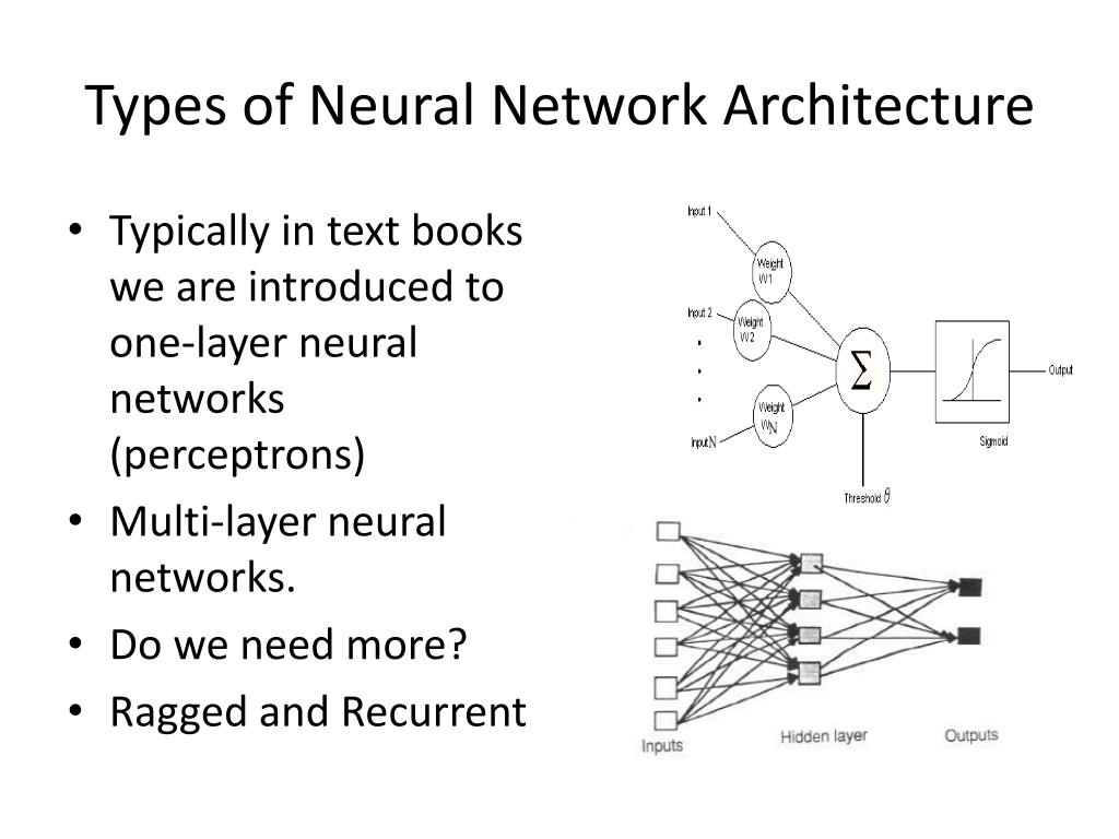 Types of Neural Network Architecture • Typically in text books we are introduced to one-layer neural networks (perceptrons) • Multi-layer neural networks. • Do we need more? • Ragged and Recurrent