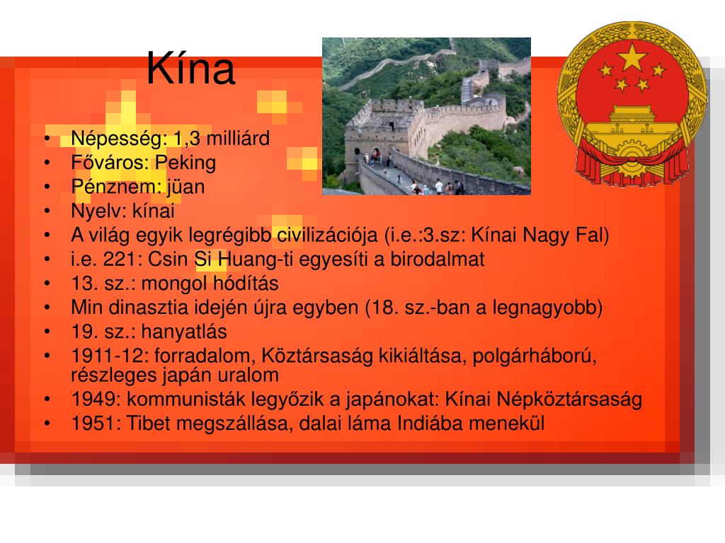 Kína • Népesség: 1,3 milliárd • Főváros: Peking • Pénznem: jüan • Nyelv: kínai • A világ egyik legrégibb civilizációja (i.e.:3.sz: Kínai Nagy Fal) • i.e. 221: Csin Si Huang-ti egyesíti a birodalmat • 13. sz.: mongol hódítás • Min dinasztia idején újra egyben (18. sz.-ban a legnagyobb) • 19. sz.: hanyatlás • 1911-12: forradalom, Köztársaság kikiáltása, polgárháború, részleges japán uralom • 1949: kommunisták legyőzik a japánokat: Kínai Népköztársaság • 1951: Tibet megszállása, dalai láma Indiába menekül