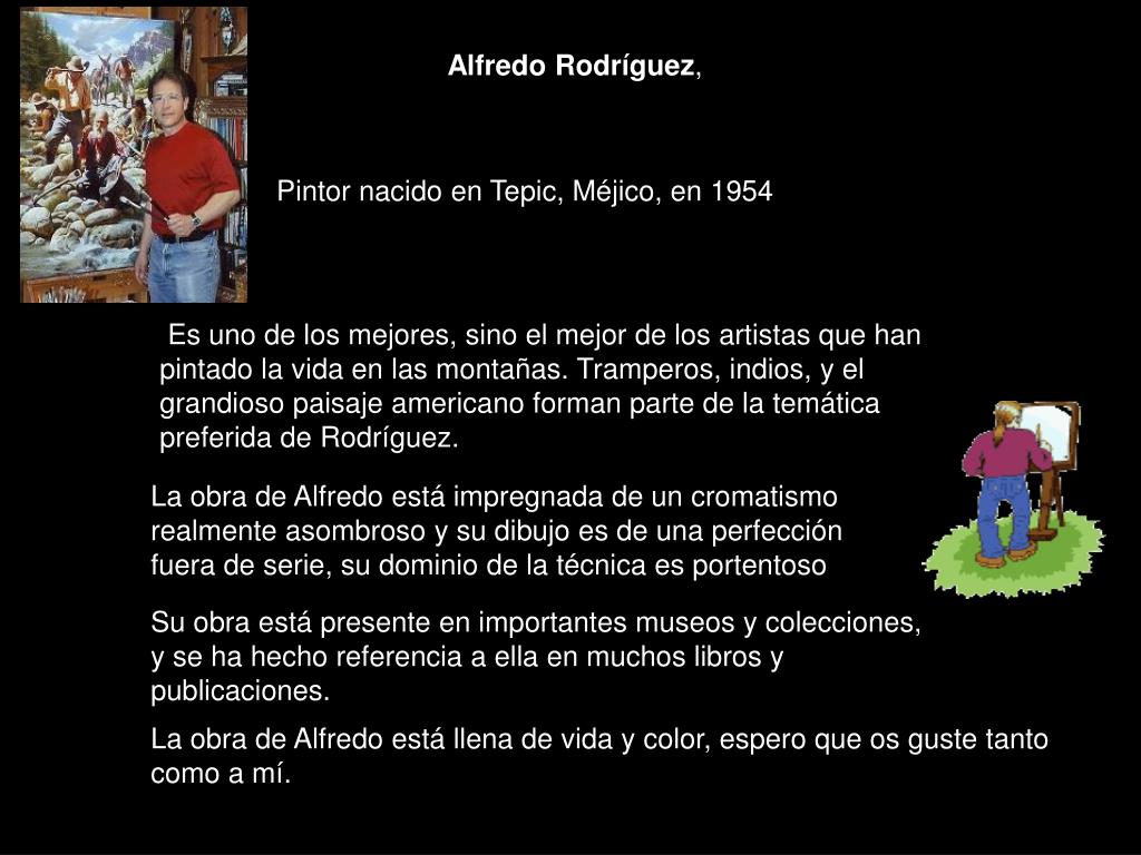 Alfredo Rodríguez, Pintor nacido en Tepic, Méjico, en 1954 Es uno de los mejores, sino el mejor de los artistas que han pintado la vida en las montañas. Tramperos, indios, y el grandioso paisaje americano forman parte de la temática preferida de Rodríguez. La obra de Alfredo está impregnada de un cromatismo realmente asombroso y su dibujo es de una perfección fuera de serie, su dominio de la técnica es portentoso Su obra está presente en importantes museos y colecciones, y se ha hecho referencia a ella en muchos libros y publicaciones. La obra de Alfredo está llena de vida y color, espero que os guste tanto como a mí.